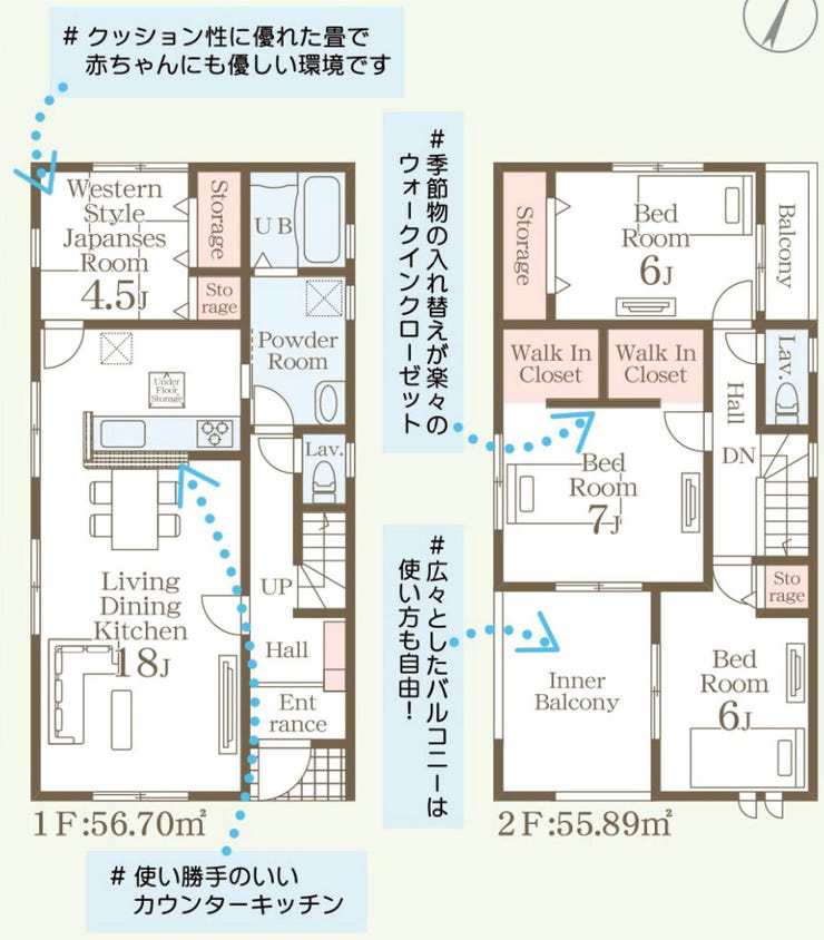 LDKは広々18帖、対面キッチンで自然と会話が生まれる空間。 それぞれの居室に収納付きで、家の中はいつもすっきり片づけられます♪